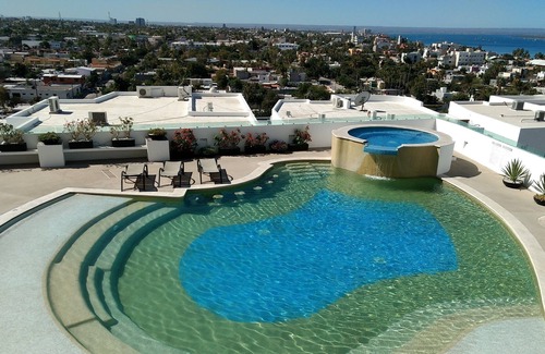Condo Located in the Alttus Sunset Condominium development. This is a two bedroom two full bath unit located on the second floor. Great views from the balcony and master bedroom overlooking the city, the bay, and the pool. The development is gated, 24 hour security, pool, Jacuzzi, gym, fire pit, gated parking and BBQ area. Although the development is not close to the Malecon it is very close to downtown La Paz.