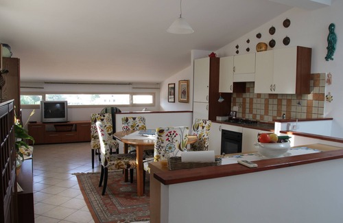 You access the apartment from a private entrance door for the exclusive use of guests on the ground floor, you go up an elegant internal staircase that leads to a large air-conditioned living room with views of the Etna and a double sofa bed, which in in case of need, hosts the 5th and 6th guests in two separate beds. The kitchen is equipped with every useful accessory and the rich library will keep you company if you are looking for tranquility. The living room leads to two bedrooms with always fresh and clean sheets, a bathroom and a small terrace. The master bedroom has a double bed and a dressing room, the second is a double sofa bed. The bathroom has a shower and towels.