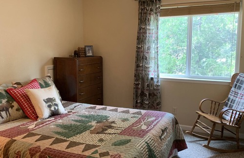 Downstairs you will find the living room with a wood burning fireplace (wood provided), smart tv and WiFi for Netflix, etc, a fully stocked kitchen with gas cooktop, refrigerator, oven, dishwasher, microwave, Keurig (pods provided) and regular coffeemaker and everything for your cooking needs from crockpot to mustard.