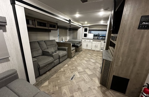 This space is fully equipped with a king size bed, a pull out couch, and the dining area also turns into a bed as well. WiFi is included in the stay, as well as basic amenities such as towels, basic kitchen supplies, a dishwasher, coffee maker and two large tv’s to maximize your time inside the camper. Perfect for a relaxing getaway for two or a fun adventure with the fam!