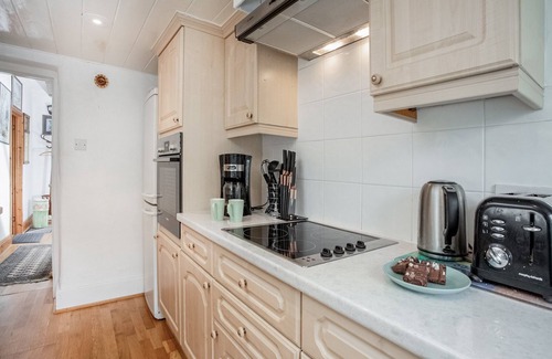 Bathroom: Bath With Shower Attachment, Cubicle Shower, Heated Towel Rail, Toilet. Electric central heating, electricity, bed linen, towels and Wi-Fi included. Highchair. Back garden with patio and garden furniture. Public car park at cost, 200 yards. 2 dogs welcome. No smoking. Please note: There are 10 steps in the garden. . Nestled in the heart of the coastal village of Polruan, this enchanting cottage is a captivating retreat just yards away from the picturesque harbour. As you ascend a small flight of stone steps from the street, you’ll be greeted by a hallway adorned with original artwork. To the right, a door leads to the inviting dining area featuring a charming table and chairs, seamlessly connecting to the lounge through sliding doors. The lounge is a cosy haven with a delightful window seat offering enchanting views, a perfect spot for immersing yourself. An impressive wood-burning stove and stone fireplace serve as the focal point. Here, you’ll find a twin sofa and a reclining chair, perfect for unwinding. The galley-style kitchen boasts modern amenities, including a Delonghi coffee machine. Stepping through the kitchen door you’ll discover a communal garden area with steps leading up to a private and delightful patioed seating area, an ideal spot for relaxation and al fresco dining.