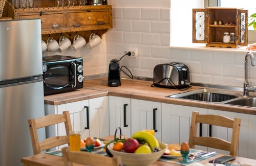 With its rustic and modern design it combines the old with the new and it is the most charming for lovers in the countryside, peace, and exploration.Located just 10 meters from the village square, from the tourist shops and taverns that serve traditional goodies at the same time has the privilege , since it has a backyard with a garden to give the guest the privacy needed with a view of the sunrise on Attaviou, the tallest mountain of the Dodecaneseon, as well as offering them sunny noon at its flowery garden.