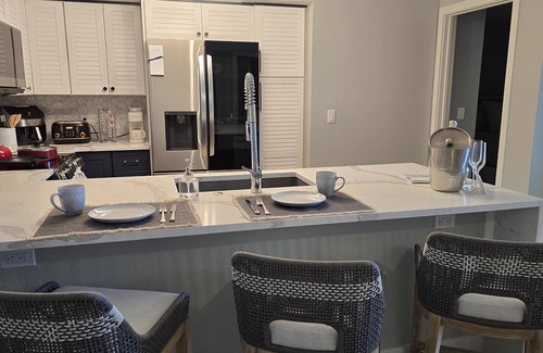 This two-bedroom unit offers a unique experience for the lucky tenant. It truly is a gem not to be missed. (Sleeps up to 4) The kitchen offers modern wood cabinets with a beautiful waterfall quartz countertop and boasts modern conveniences with all the cookware, utensils and necessary items to create meals and indulge. The luminous living room and dining area are furnished for relaxation, featuring a dining table for six, wine fridge, comfortable seating and a large smart TV for entertainment. Step out onto your private balcony as the perfect spot to savor your morning coffee or to gaze at the stars while enjoying the peaceful marina's allure with the intracoastal as a backdrop.