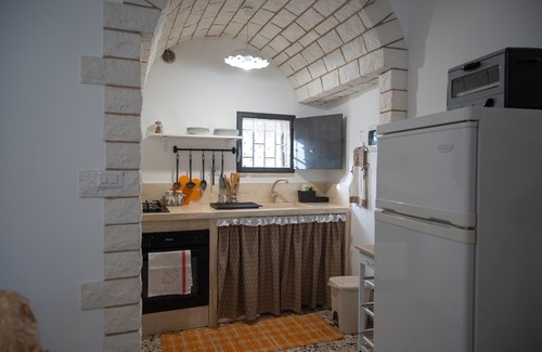 The bedrooms, one of which in a trullo with a conical ceiling, have a double bed each for a total of 4 beds and the possibility of adding a cot next to each bed. The kitchen is fully equipped with oven, hob, fridge, toaster, kettle, coffee maker, pots, plates, various dishes and spices. In the living room you can enjoy the rustic-style fireplace for warmth and intimacy even in cold periods.