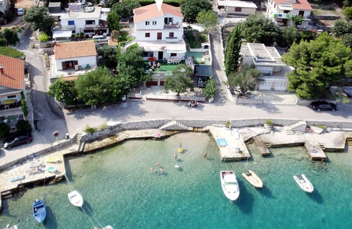 Apartment house "Andriana". 2.5 km from the centre of Grebaštica, 10 km from the centre of Primošten, 20 km from the centre of Šibenik, 10 m from the sea, 10 m from the beach, in a cul-de-sac. For shared use: property 600 m2 with trees. Terrace, barbecue. In the house: internet access. Parking on the premises. Shop 2.5 km, supermarket 10 km, restaurant 10 km, bus stop 900 m, concrete beach 10 m. Please note: airfield 45 km from the property.