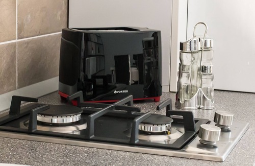 Bucataria este echipata complet cu aparatura electrocasnica noua: frigider, plita si cuptor electric, microunde, filtru cafea, prajitor de paine, masina de spalat rufe.