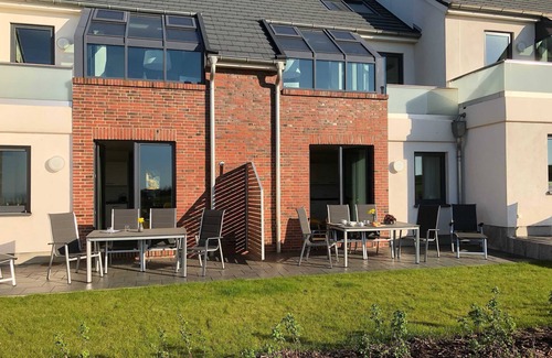 The luxurious apartment has about 55 square meters and is located on the ground floor. The living area with open, fully equipped kitchen and dining area has access to the terrace and an unobstructed view of the North Sea and the green Oberland. A second terrace is located on the southern sun side of the apartment. Bedroom has a comfortable double bed, shower room and toilet are separate. Wi-Fi, TV and radio / docking station are available, sheets and towels are included and are changed for longer stays. There are washing machines and dryers available for a fee (coins) in the basement.