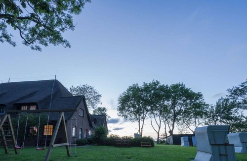 High quality apartments in Haubarg Windschuur on Eiderstedt in the world. The 1837 built as a typical Eiderstedter farmhouse building has been lovingly restored in recent years. Today there are 10 separate apartments under the thatched roof. In winter, the entire interior was renewed, so that the Haubarg windshower shines from Easter 2015 in new splendor. Surrounded by a spacious garden, the Haubarg is idyllic and quiet in the green marshes. The Eider barrage provides protection against winter storms 7 km away, the seaside resort of St. Peter-Ording can be reached in about 12km. The sea with a guarded swimming area in Vollerwiek only about 4km away. For family celebrations or other events, Haubarg Windschuur is also available to rent in its entirety if requested in good time. The spacious hall and the spacious garden with its old trees provide a noble North German ambience and comfortable accommodation for more than 40 people. The town of Garding with its shops, restaurants, cafe, weekly market and various events is also only about 2km away. The wide sandy beaches of St. Peter Ording is just 10 minutes away by car. The DLRG-guarded swimming area in Vollerwiek, with showers and a snack, it is only 2km. It is easy to reach by bike. in Welt there is a Kirchspielkrug with North Frisian specialties. TIP: From 01. 05.-31. 09. are offered there 4 times a week buffet days. The Matjes, suckling pig, skipper and Eiderstedter buffet are very popular and you must try it