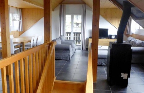 "Andromède 5-pièces 12", 5-room apartment 163 m2 on 2 levels, on the upper floor. Comfortable and cosy furnishings: 2 rooms, each room with 1 double bed. Exit to the balcony. 1 room with 1 double bed. 1 room with 1 pull-out bed (2 pers.). Bath/WC, shower/WC. Top floor: living/dining room with sloping ceilings with Scandinavian wood stove, cable TV and hi-fi system. Exit to the balcony. Open kitchen (oven, dishwasher, 4 ceramic glass hob hotplates, microwave, electric coffee machine, fondue Set (cheese)). 2 balconies 13 m2. Terrace furniture. Very beautiful view of the mountains and the countryside. Facilities: hair dryer. Internet (WiFi, free). Please note: non-smokers only. Maximum 2 pets/ dogs allowed.