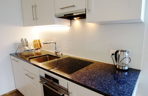 40 m2. More information by the provider: The bright 2-room apartment is located on the ground floor of a new single-family house in a particularly quiet location. The apartment is completely and newly furnished and consists of a cozy living/dining room, bedroom and ultra-modern bathroom. The kitchenette with granite tops, refrigerator with freezer compartment and dishwasher offer you everything you could ever need. A filter coffee maker and a Nespresso coffee maker are available. The living room has a sofa bed (140x200cm), a dining table with bench and upholstered chairs, TV (Internet TV) and DVD player. Internet (WiFi) is available free of charge. The bedroom is equipped with a double bed (160x200cm), wardrobe and dresser. Washing machine and dryer are available in the apartment. A cot, high chair and toys are available on request. Small pets are possible on request.