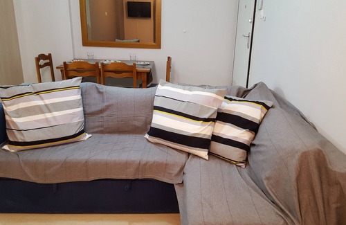 A modern apartment in the heart of Vraxati Korinthias. Ideal for 5 guests. The apartment is by the sea,(without road in front of the apartment, it is exactly in the beach) the balcony has sea view. Located one minute from the restaurantrs, coffee and tavernes of Vraxati. Modern apartment fully renovated in May 2017.Located in a friendly neighbouhood in the centre od vraxati, by the sea. Living room:TV set and one aircondition. Equipped with one couch that can be transformed to a double bed and two small tables. There is also a dining table with 4 chairs. Kitchen: Fully equipped . Oven microwave, one toaster, coffe maker, dishes, glasses, fridge and kitchen. Bedroom: two beds and a big wardrobe, here is also an aircondition. Towels are supplied for each guests as well as blow dryer, iron and board are also available. Bathroom: There are hari shampoo, body wash and also hair dryer. Balcony:A big balcony with view in the sea, quite neighbourhood you can relax in the confortable Pillows. There is also a table with chairs.The centre of Vraxati is in 100 metres from the apartment. There are a lot of restaurants with delicious foods, bars, coffe, super market is in the400metres. The market is on the parallel road where you can find everything, bank, mini market, greengrocer, pharmacy. There are also a lot of places with umbrellas and deck chairs.