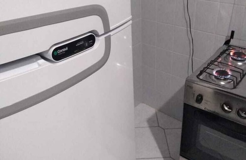 Simple apartment. Kitchen with stove and refrigerator and masonry cabinets. Cutlery, plates, glasses, etc ...