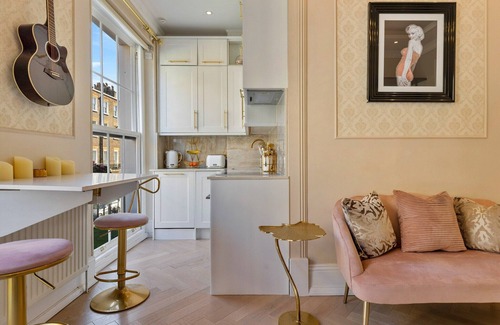 Located in the heart of London, this elegant boutique apartment offers a luxurious retreat in the charming and historic Marylebone neighborhood. Situated on a peaceful street within a Georgian building, it provides a perfect setting for a romantic getaway or a stylish city break for two. Enjoy stunning views from the balcony as you unwind with a glass of wine while watching the sunset over London's skyline. The interior features classic, sophisticated decor with high ceilings, chandeliers, and a color palette of dusky pinks and brass accents. The spacious living area includes a smart TV, high-speed Wi-Fi, and a dedicated workspace. The fully equipped kitchen boasts Siemens appliances, including a fridge, freezer, dishwasher, microwave, oven, and hob, with the added convenience of a washer/dryer. The bedroom has a king-sized bed, four double wardrobes, and a dressing table, while the luxurious bathroom offers a whirlpool Jacuzzi bath, shower, and marble finishes. Marylebone is renowned for its quiet charm, with a mix of quirky museums, independent shops, traditional pubs, and chic boutiques. Outdoors, Regent’s Park is just a short stroll away, providing ample space for relaxation. Parking options include on-street parking on Balcombe Street and nearby NCP car parks. Please note, the apartment is on the first floor and accessible via a single flight of stairs, and well-behaved dogs are welcome to join your stay.