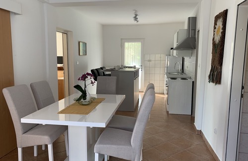 With its five apartments, the house "Mirta" is only 500 meters from the sea and the center of Rabac. Each apartment has a spacious terrace or balcony with a view of the sea, the islands of Cres, Losinj and Unije and the old town of Labin, ideal for a daily breakfast or a glass of wine at sunset. You can also spend a fun, relaxing night with your family and friends while barbecuing in the garden.