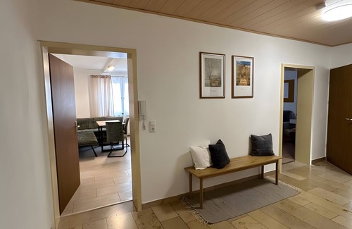 The 60 m² Apartment 'Lang' is located in Steinfeld, Stadelhofen, and accommodates up to 4 guests. It features 2 bedrooms, a separate shower room, and a bathroom with toilet and urinal. The main bedroom has a 1.80 m wide bed, the smaller bedroom has a 1.20 m wide bed. An extra bed or baby cot can also be provided.
