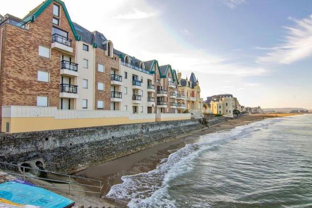 Trouville sur Mer: Residence "Les Flots", 3 storeys. 10 m from the sea, direct access to the beach. In the complex: lift. Shop 850 m, grocery 950 m, supermarket 1.1 km, restaurant 850 m, railway station "Deauville-Trouville" 1.8 km, indoor swimming pool 1.2 km, thermal baths "Trouville sur Mer" 1.2 km. Golf course 6.4 km, sailing school 250 m, tennis 700 m. Nearby attractions: Hippodrome Deauville-La Touques 4.2 km, Honfleur 14 km, Mémorial de Caen 51 km, Plage du débarquement d'Arromanches 87 km. Please note: the keys‘ handover takes place by the agency Interhome in Deauville. There are more similar properties for rent in this same residence. 2-room apartment 70 m2 on 2 levels on 2nd floor. Entrance hall. Living/dining room with TV (flat screen). Exit to the balcony. Large, open kitchen (oven, dishwasher, 4 ceramic glass hob hotplates, toaster, kettle, microwave, freezer, electric coffee machine). Shower/WC. Upper floor: open walk-through room with 3 beds (90 cm). 1 room with 2 beds (90 cm). Exit to the terrace. Bath/WC. Electric heating. Balcony 2 m2, west facing position and north facing position, terrace 3 m2, south facing position and, east facing position. Very beautiful view of the sea. Facilities: washing machine, iron. Internet (WiFi, free). Please note: non-smokers only. Smoke alarm. Included in price: ERV cancellation insurance ( 2021-08-23 - 2023-02-23 ) Final cleaning ( 2021-08-23 - 2023-02-23 ) Garage 1x ( 2021-08-23 - 2023-02-23 ) Laundry (initial supply of bed linen and towels) ( 2021-08-23 - 2023-02-23 ) Beds made up for arrival ( 2021-08-23 - 2023-02-23 ) Local tax ( 2021-11-27 - 2023-02-23 ) Wireless internet access (WIFI) ( 2021-08-23 - 2023-02-23 ) Not included in the price and needs to be booked beforehand: Booster seat (for children) 3.0 EUR Bookable extra per day ( 2021-08-23 - 2023-02-23 ) Pushchair (Buggy) 3.0 EUR Bookable extra per day ( 2021-08-23 - 2023-02-23 ) Cot (up to 2 years) 3.0 EUR Bookable extra per day ( 2021-08-23 - 2023-02-23 ) #FR1804.225.2