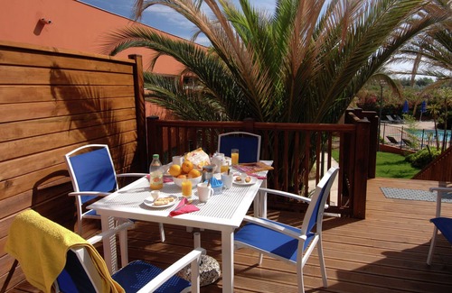 The car-free complex consists of a few main, two-storey buildings. They all feature a modern and well-maintained interior and a terrace or balcony with garden furniture. There are several different types of apartments to choose from: - Studio for two people (FR-34300-22), - Two-room apartment for 4 people (FR-34300-23; FR-34300-24 on the side of the swimming pool), - Two-room apartment with sleeping cabin for 6 people (FR-343030-25), - Three-room apartment for 6 people (FR-34300-19; FR-34300-20 on the side of the swimming pool), - Three-room apartment with sleeping cabin for 8 people (FR-34300-21.
