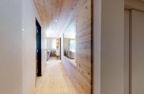 The holiday apartment was completely renovated in 2021 and features a blend of modern materials, appliances, and alpine style. The spacious living room with a fireplace, sofa, and dining table offers breathtaking views of Samedan. From the living room, you can access the south-facing sun terrace. The state-of-the-art kitchen is fully equipped. All three bedrooms have their own bathrooms with either a shower or bathtub and are furnished with double beds. Additionally, there is a guest WC near the entrance.