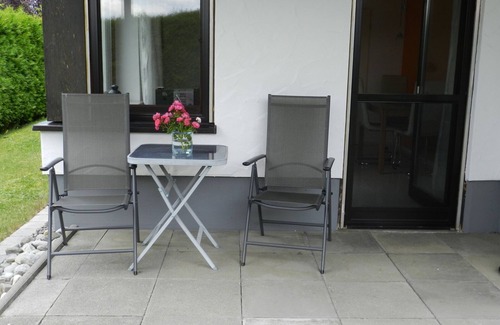 The 50 m² apartment is located on the first floor and is ideally equipped for up to 3 people. The apartment has a separate, fully equipped kitchen. The cozy couch in the living room invites you to relax. One of the two bedrooms is furnished with a double bed, the other with a single bed. The bathroom is new and equipped with a walk-in rain shower, WC and hairdryer. The apartment also has a terrace where you can relax undisturbed and enjoy beautiful sunsets. The covered terrace allows you to stay outside even in rainy but warm weather. A free parking space is available.