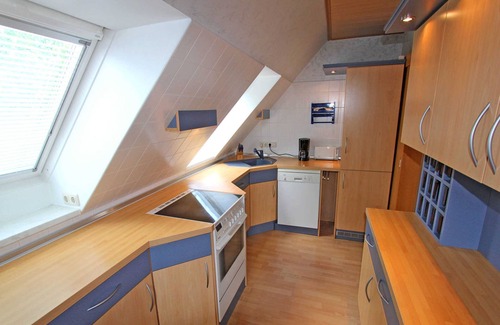 The large apartment extends over the entire upper floor. It is equipped with a living room (upholstered furniture with sleep function, flat screen TV, radio, oven), a kitchen (stove with oven, refrigerator with freezer, microwave, dishwasher, dining table, div. Kitchen appliances), two bedrooms (1 x double bed, 1 x 2 single beds), bathroom with bath and shower and central heating.