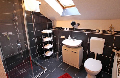 The large (54 sqm) apartment in the main building for a maximum of 5 people has a spacious living room (double bed, extra bed with a couch possible, satellite TV, small dining table - extendable), another bedroom (two single beds can be put together - satellite TV, small dining table), a separate mini kitchen (electric plates, refrigerator), a spacious hallway and bathroom with shower / WC.