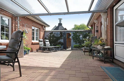 It extends over two floors. An inner courtyard with partially covered terrace, as well as a garden with beach chair and garden furniture may be used with pleasure. The surrounding area and the very well-developed network of cycle paths are ideal for excursions in the middle of the North Frisian countryside. You are welcome to store your bicycles in a lockable room. In the months of May to September you can cool off in our beautiful, heated outdoor pool.