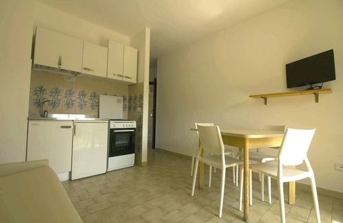 Layout: Living room(double sofa bed, TV), Kitchenette(cooker(gas), microwave, fridge), bedroom(double bed), bathroom(bathtub or shower, washbasin, toilet), balcony or terrace, heating, air conditioning, garden furniture, swimming pool(shared with other guests, 5 x 4 m opened from May upto and including Sep)