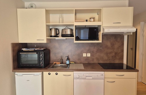 - **A fully equipped kitchen**: dishwasher, mini-oven, coffee maker, and everything you need to prepare meals just like at home.