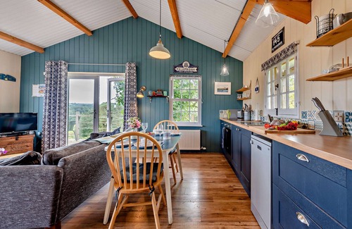 As you enter the cabin you are welcomed into your well-proportioned open-plan lounge/kitchen/diner which is flooded with light from the french door offering views over the garden and countryside. The lounge enjoys a two comfortable sofas centred around the Smart TV and cosy wood burner. Enjoy peaceful evenings in front of the fire enjoying your favourite films and TV shows after a fun day of exploring the coast and countryside. There's a dining table for two adjacent to the contemporary kitchen, perfect entertaining space for a couple. From the lounge you will find your double bedroom and a shower room with a shower and WC.