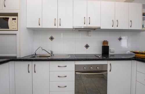 Large window views of the sparkling water and tiled, open plan living greets you upon entry. There is a comfy lounge area with a TV, a 6-seater dining table and a fully equipped kitchen with oven, cooktop, microwave and full sized fridge/freezer. Salty sea breeze cools the apartment and it is also air-conditioned throughout (cooling only) .