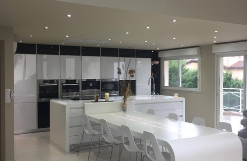 New villa for 10 people including contemporary architecture, open space kitchen opening onto cathedral lounge decorated with bay windows facing Cap Ferret.