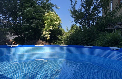 In the 2. Floor of this house is a nicely cut apartment: tower room with fireplace wood stove and wide view, spacious kitchen overlooking the greenery, a bright spacious bedroom, a large living room and two cozy children's rooms. The 2000 m² garden behind the house is with usable and provides relaxation in the middle of the mountain town of Marienberg.