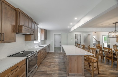 • Stunning open floorplan featuring expansive windows, fireplace, TV, and luxury furniture in the living room, TV, fully equipped kitchen with expansive center island, separate dining area
