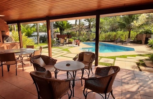 House with style and well decorated, very comfortable until to 10 people, very close to two beautiful beaches Domingas Dias and Lazaro (150mts) with private pool, barbecue and pizza oven, with garage for 4 cars, inside a condominium with 24 hour security and in the middle of the Atlantic forest with a view of mountains.