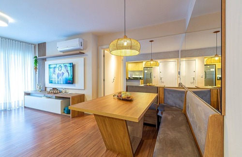 Apartamento Atalaia novo bem no centro de Canela, 3 dormitórios sendo um suíte com 2 vagas de garagem. Imóvel com churrasqueira, WI FI, cozinha equipada. Super aconchegante!