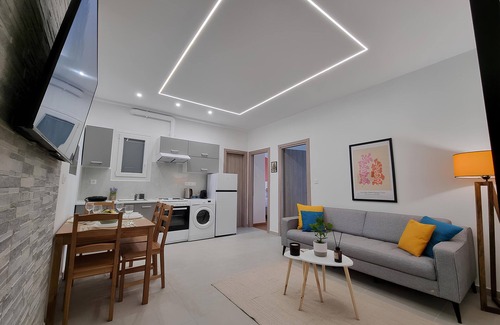 This pristine apartment, fully equipped and tranquil, with all the amenities a contemporary flat should have for a hassle free stay. In this apartment you will find an equipped kitchen with a toast maker, kettle, refrigerator and pans, dishes, glasses and cutlery. Also the apartment provides you with hot water from a sun boiler which is the most ecologically friendly way for not wasting energy (eco-friendly apartment), two air conditioning systems, comfortable beds with high quality mattresses and a sofa bed. Quality bed linens and towels are also provided. The apartment has also a smart TCL TV 55' (logging in with your Netflix account) and a WiFi up to 50Mbps speed, a hair dryer, an iron and an ironing board. The apartment is fully equipped with cozy and modern furniture. Local suggestions are also provided by my co-host George who will ease your stay and help you in everything you may need. Last but not least, self check-in process provided so your check in could be done 24 hours/day!