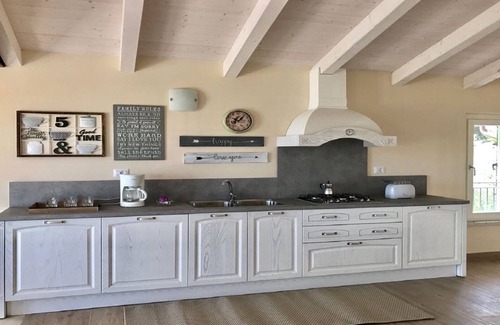 The house is totally renovated, in a simple and refined way at the same time. This is a large, very bright apartment with a wonderful view of Lake Garda, the mountains that surround it and the beautiful surrounding Morainic hills. Each room is served by a private bathroom, also there is a large living room with comfortable sofa bed. The kitchen is large and from the dining room leads to a spacious balcony that enjoys a splendid view.
