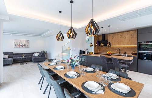 Located in Marina west of Trogir, this fully equipped vacation home invites you to a first-class vacation. The high-quality, comfortable furnishings make a modern, tasteful impression and testify to thoughtful solutions throughout the house. Look forward to preparing your delicacies in the lovely kitchen and spending sociable hours in the living area.