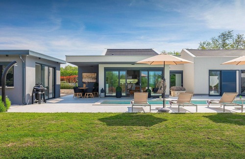 Enjoy your holiday in the beautiful, modernly furnished Villa Mala Oaza located in a small town in the heart of the green hills of central Istria. This single-storey villa offers accommodation for 6 people and is ideal for family holidays. You will certainly spend a lot of time together around the large, private pool. While you barbecue, the little ones can also play volleyball in the large garden. With plenty of garden furniture and sun loungers, the garden offers plenty of space to relax, sunbathe or rest in the shade of the parasols. All rooms in the villa are on the ground floor. The central communal room connects the kitchen, living room and dining room, furnished in warm colours with many stylish details and beautiful paintings. The kitchen with cooking island is fully equipped and offers plenty of space for cooking. The large glass door opens up the room and overlooks the villa's inviting pool. Outside you will also find the barbecue and plenty of space for al fresco dining. The hallway leads you to the three chic bedrooms with interesting wallpaper, elegantly furnished with direct access to the garden. Each bedroom with double beds has air conditioning. Here you can relax and plan your trip to the magical Istrian hinterland.Sveti Petar u Sumi is a small, relaxed place not far from large, more hectic tourist towns. The first shops are only 1 km away and larger supermarkets can be found within a 5 km radius. Although this place is quite small, you can visit a beautiful church here (the monastery church of St Peter and Paul the Apostle) if you are interested in architecture and mosaics from the Gothic era. Visit the beautiful nearby town of Pazin. For centuries, Pazin was the strongest Habsburg fortress in the area and the headquarters of the former prince. You can still visit this medieval castle (Kastel) today, as it is well preserved. Today it houses the Ethnographic Museum of Istria and the Museum of the Town of Pazin. Discover the hinterland by hiking or cycling and taste famous Istrian specialities such as truffles.