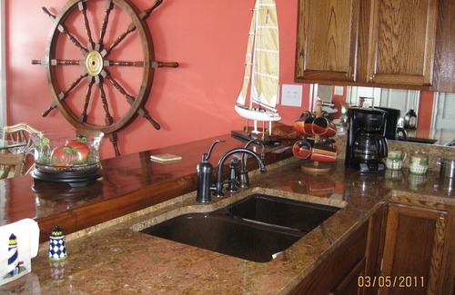 Our condo accommodates a maximum of six people with its three bedrooms and three baths. The master bedroom has a king-size bed, 42 inch flat screen HDTV with Blu-ray player, and an additional large sliding door entrance to the 30 foot balcony. Your master bath includes a Jacuzzi tub, walk-in shower and a double sink vanity. The yellow bedroom has twin beds which can be converted to a king-size bed, 42 inch HDTV with DVD player, desk, a window with views of the channel, inlet and golf course beyond and an adjoining bath with a tub/shower combination. The green bedroom has the same marvelous view, queen size bed, and a 32 inch flat screen HDTV with DVD player. The adjoining bathroom has a tub/shower combination and also opens to the hallway.
