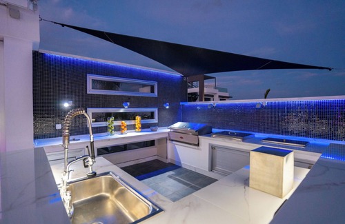 Villa 011 is a 3-story super home with private gated access with video entry systems, 2 Car Garage with Electric Door, Outdoor projector Cinema Room BOSE lifestyle Surround Sound, 15 x 8m Luxury walk-in overflow infinity pool one of the biggest private swimming pools in Cyprus. Modern poolside Hot Tub perfect place to completely unwind, relax and cool down in the pool while listening to your favourite songs from the pool side speakers, controlled by Sonos so just Bluetooth connect your phone or iPad for your personal music library.