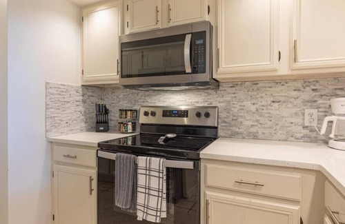 Just minutes from the "Branson Strip", the Showboat Branson Belle, Table Rock Lake, Silver Dollar City (only 8 miles away!) and Big Cedar Lodge. Once inside the villa, you'll enjoy a renovated kitchen with white cabinets, quartz counters and new stylish backpack. Brand new stainless-steel appliances will make cooking for your group easy! All cookware and dinnerware is provided. The dining table seats six, with additional stools at the breakfast bar. From the living room, you'll be able to watch a movie, big game or favorite Netflix show on the 65-inch Smart TV. Enjoy a glass of wine or coffee from the balcony or the rain free covered patio below overlooking the Pointe Royale Golf Course and clubhouse. There are two bedrooms with king beds and one with a queen bunk bed, all with plush bedding. Smart TVs are also included in the two king bedrooms. Two full bathrooms include shampoo, conditioner, towels and hair dryer.