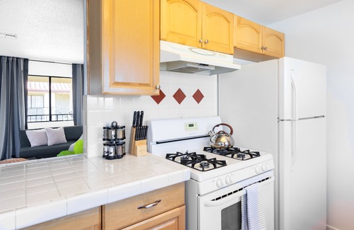 Take in warm desert air from private balcony of this 2 bedroom, 1 bathroom apartment with fully stocked kitchen. The living room has a futon sofa and a king size bed in each bedroom for a restful night’s sleep. The courtyard is a serene desert garden perfect for an evening under the warm glow of the string lights. 2nd floor unit, Wi-Fi, NEST thermostat. Parking for one vehicle in driveway. Unit comfortably sleeps 5 guest.