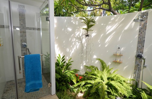 Very bright room overlooking the pool and the sea. Its originality: an outdoor bathroom nestled in the cocoon of its private garden.