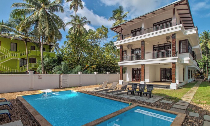 This villa is 10 min walk to Calangute beach, has AC in the living room, 4 AC bedrooms & en-suite bathrooms with shared swimming pool (2 bedrooms locked). Free WiFi with 50-100+ mbps speed.