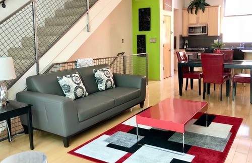 Posh modern elegance offering everything you need. This 3 floor loft in the award winning Silver Lofts offers luxurious modern leather furnishings; fully appointed kitchen; library, premium cable & wifi and washer/dryer. Located in a quiet & friendly neighborhood, two streets off of Central Ave, we are peacefully isolated from Downtown ABQ's night life. Walk to restaurants, farmer's market, zoo, train, & art galleries. NON-SMOKING.