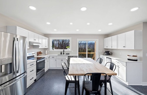 Delight in our open concept kitchen, designed for both culinary enthusiasts and family gatherings. The kitchen is equipped with modern white cabinetry, stainless steel appliances including a high-end stove and oven, a large refrigerator, and a dishwasher for easy cleanup. A coffee maker and toaster are also available, ensuring your breakfast needs are fully met. The adjacent dining area, with its large table surrounded by large windows, allows natural light to enhance your meals while providing stunning views of the surrounding landscape.