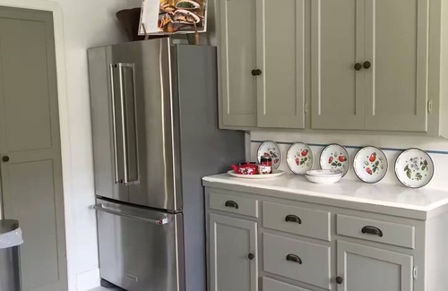 A fully stocked Kitchen with new stainless steel refrigerator, microwave, dishwasher and a toaster oven. An antique Wedgwood stove is surrounded by charming original 1930's kitchen cabinets resurfaced in a soft French grey amid beautiful Mission tile floor.