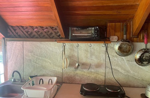 second floor wooden chalet with one bedroom (good for up to 3 people), bathroom, air condition, WIFI, and a nice balcony with a fully equipped kitchen.