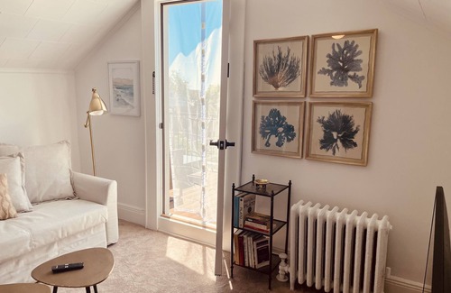 The apartment boasts a furnished private balcony with outstanding 270-degree views with eastern, western, and southern exposures. Beach passes, beach chairs, beach umbrella, and beach towels included. Also included is a crucial amenity: dedicated off-street driveway parking (this is a must-have during the summer months). Exudes historic charm, including original 1930s stained glass window and cast-iron, claw foot bathtub with shower. Mod-cons, too: TV (with Apple TV), WiFi, AirCon, baseboard heaters, coffee bar, pantry with selection of complimentary snacks. Well-appointed kitchenette (small but efficient). Laundry service included in rent. This is a cottage-like A-frame apartment: it is super cute and cozy, headspace is lower in corners (see photos). MAX guests: 4 people. No pets please.